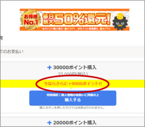 ※30,000pt購入で今なら通常は9,000pt(30%)のポイント還元率が保証されています。